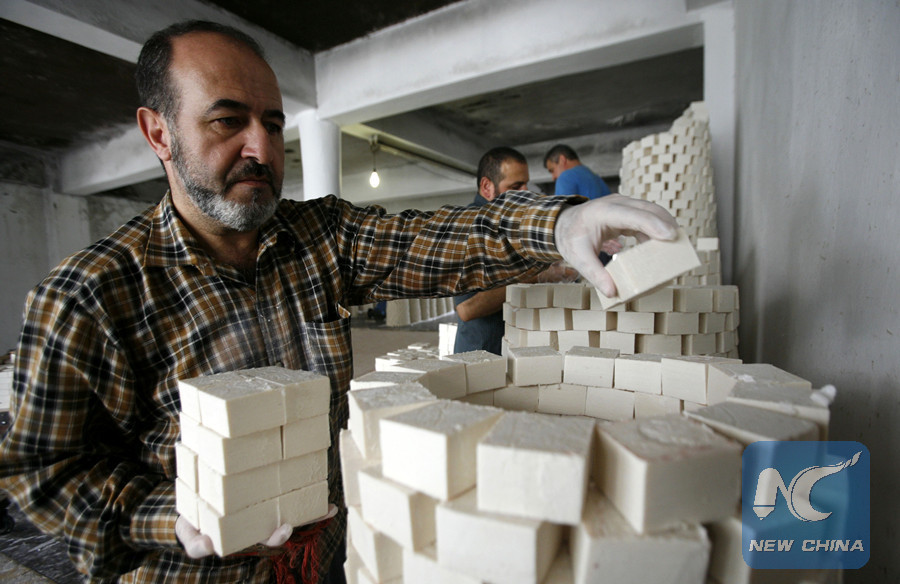 (File photo)Palestinian worker lines up soap pieces at the Touqan factory in the West Bank city of Nablus, on Oct. 8, 2012. The Touqan factory is one of the oldest manual factories in Nablus that manufactures the natural "Nabulsi Soap" since 1894. (Xinhua/Ayman Nobani)