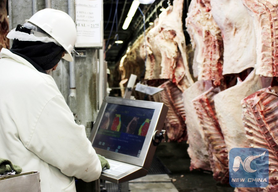 A worker checks the quality of beef by a device at the Greater Omaha Packing company which exports U.S. beef to China, in Omaha, the United States, Nov. 1, 2017. (Xinhua)