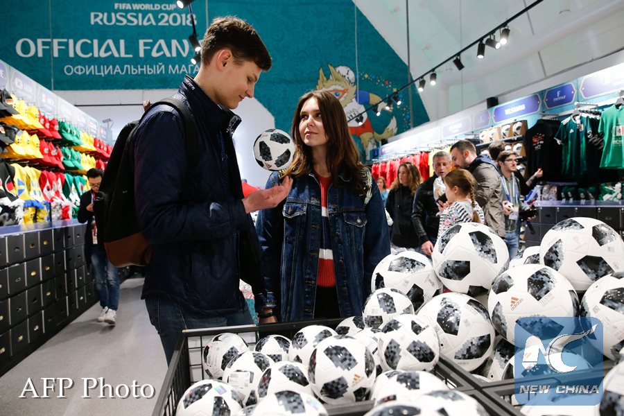 Visitors look at balls at the official shop of the FIFA Fan Fest in Moscow, on June 10, 2018, ahead of the Russia 2018 World Cup. (AFP PHOTO)