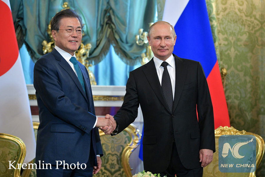 MOSCOW, June 22 (Xinhua) -- Russian President Vladimir Putin and visiting South Korean President Moon Jae-in on Friday agreed to keep working together to resolve the Korean Peninsula issue, including ensuring full implementation of the agreements reached by Pyongyang and Washington, the Kremlin said.