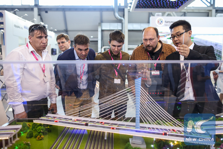 People look at the scale model of a railroad during the Russia-China expo at Innoprom Exhibition-2018 in Yekaterinburg, Russia, on July 9, 2018. (Xinhua/Evgeny Sinitsyn)