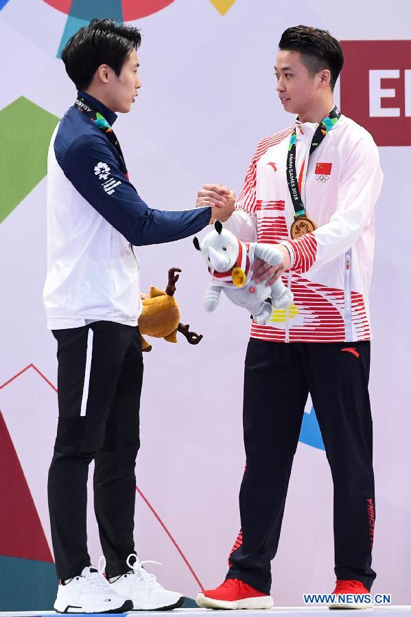 Gold medalist Wu Zhaohua (R) of China shakes hands with silver medalist Cho Seungjae of South Korea during the awarding ceremony for Men's Daoshu & Gunshu All-Round at the 18th Asian Games in Jakarta, Indonesia, Aug. 21, 2018. (Xinhua/Cheong Kam Ka)
