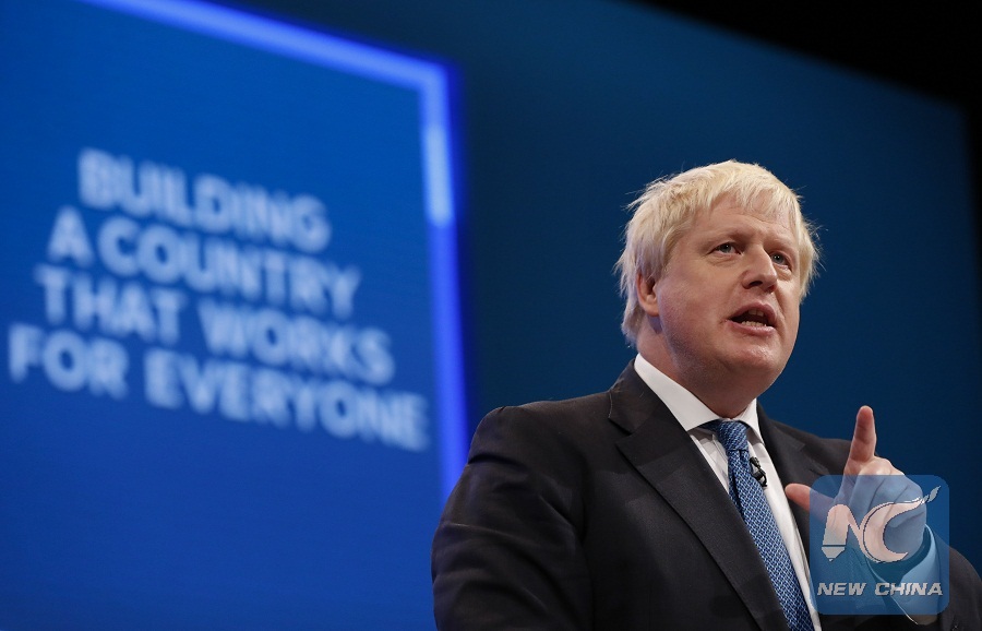 The file photo shows then British Foreign Secretary Boris Johnson delivers his keynote speech at the Conservative Party's annual conference in Manchester, Britain, on Oct. 3, 2017. (Xinhua/Han Yan)