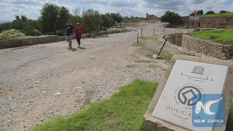 Two Chinese tourists visit the Dougga archeological site in northern Tunisia on Sept. 26. (Xinhua photo)