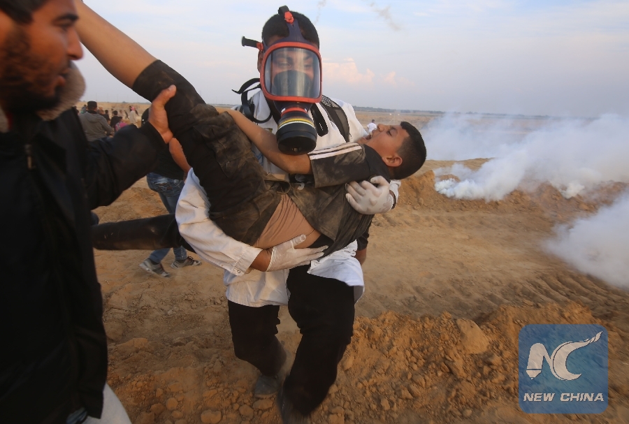 File Photo: A Palestinian medic transfers a wounded man during the clashes near the Gaza-Israel border, east of the southern Gaza Strip City of Khan Younis, on Nov. 9, 2018. (Xinhua/Khaled Omar)