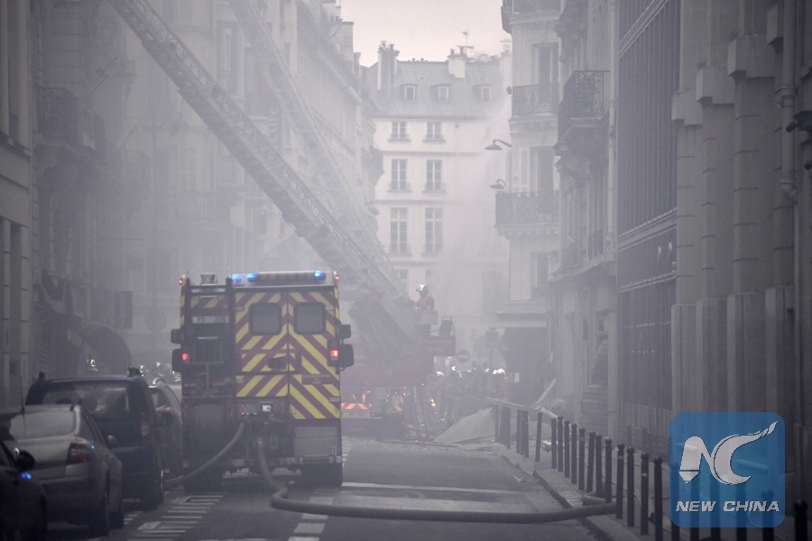 Firefighters work at a blast site amid smoke and dust in Paris, France, Jan. 12, 2019. A huge gas explosion in central Paris injured at least 20 people on Saturday, of whom two were in critical condition, Le Figaro newspaper reported. The explosion occurred at around 9 a.m. (0800 GMT) in a closed bakery on the Rue de Trevise in the 9th district of Paris due to a suspected gas leak. (Xinhua/Chen Yichen)