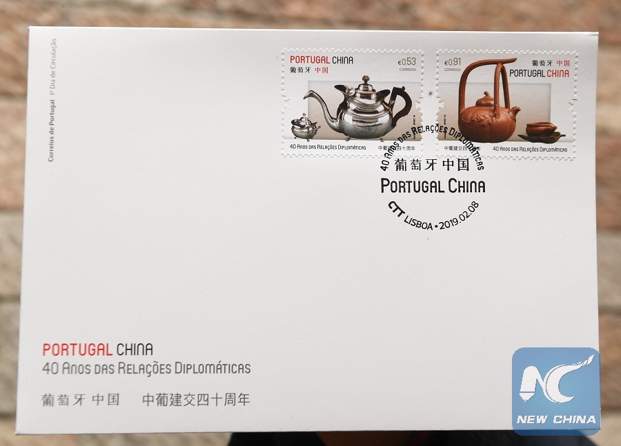 LISBON, Feb. 9 (Xinhua) -- The Portuguese post office CTT on Friday issued a set of two commemorative stamps with the first day cover to celebrate the 40th anniversary of the establishment of diplomatic relations between Portugal and China.