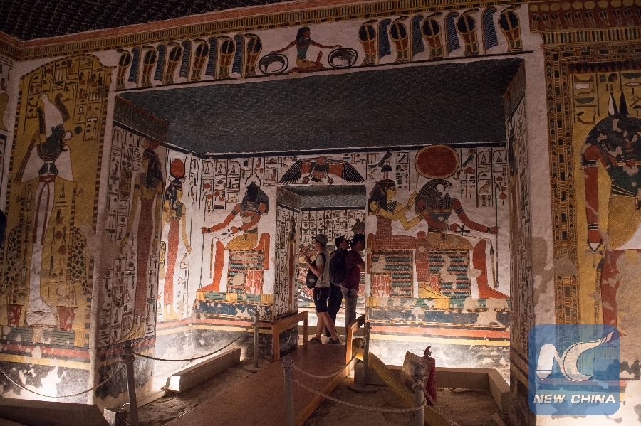 Photo taken on April 18, 2019 shows the mural paintings inside the tomb of Nefertari, the wife of ancient Egypt's Pharaoh Ramesses II, at Valley of the Queens in Luxor, Egypt. Discovered in 1904, the tomb is famous for its mural paintings with vivid colors. (Xinhua/Meng Tao)