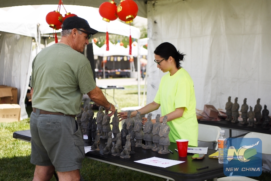 A visitor selects Terracotta Warrior souvenirs at the 2019 U.S.-China Cultural Tourism Festival in Las Vegas, the United States, May 11, 2019. (Xinhua/Han Fang)