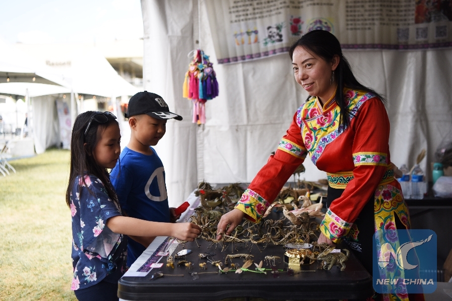 Jiang Furong (R), representative inheritor of China's intangible cultural heritage Qiang traditional grass weaving, shows grass weaving products to children at the 2019 U.S.-China Cultural Tourism Festival in Las Vegas, the United States, May 11, 2019. (Xinhua/Han Fang)