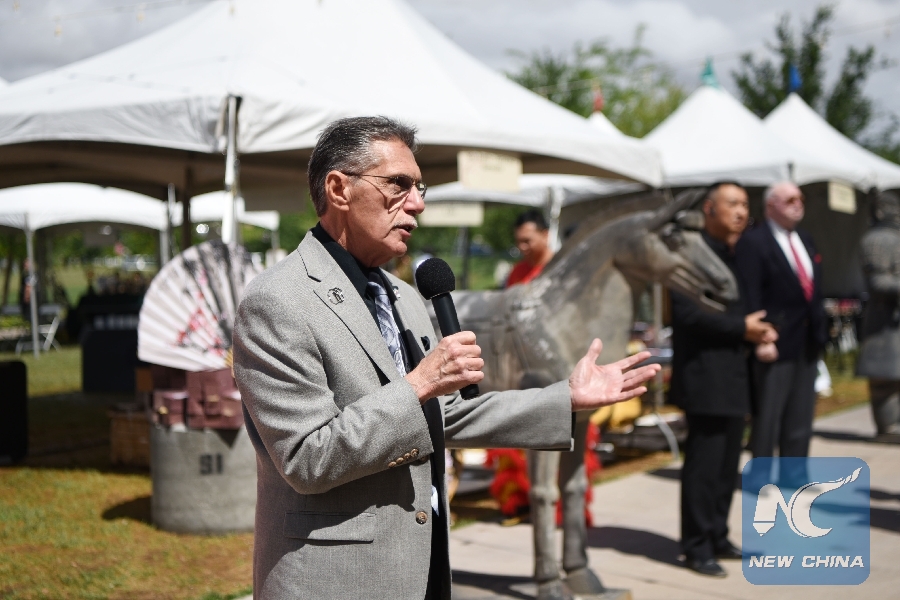 Richard Cherchio, a councilman in the City of North Las Vegas, addresses the opening ceremony of the 2019 U.S.-China Cultural Tourism Festival in Las Vegas, the United States, May 10, 2019.(Xinhua/Han Fang)