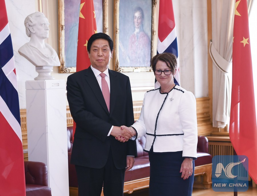During the stay in Norway, Li, chairman of the Standing Committee of the National People's Congress (NPC), met with Norwegian King Harald V, Norwegian Prime Minister Erna Solberg and President of the Norwegian parliament Storting Tone Wilhelmsen Troen.