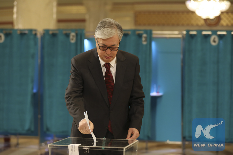 Kazakh President Kassym-Jomart Tokayev casts his ballot at a polling station in Nur-Sultan, Kazakhstan, June 9, 2019. Kazakhstan's presidential election kicked off on Sunday with seven candidates vying for the top office. (Xinhua/Kalizhan Ospanov)