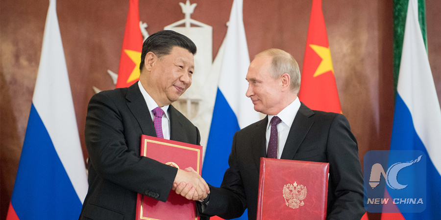 Chinese President Xi Jinping (L) and his Russian counterpart Vladimir Putin sign the statements on elevating bilateral ties to the comprehensive strategic partnership of coordination for a new era and on strengthening contemporary global strategic stability, and witness the signing of a number of cooperation documents, after their talks in Moscow, Russia, June 5, 2019. (Xinhua/Li Xueren)