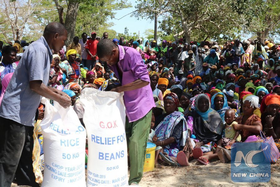 File photo shows residents were waiting for the distribution of relief food at Bamba village in Kilifi County, Kenya in March 2019. The residents are facing an acute shortage of food and clean water due to prolonged drought in the area. (Xinhua/Allan Mutiso)