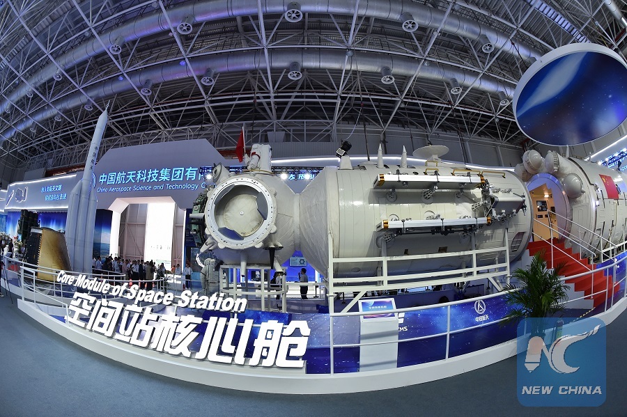Photo taken on Nov. 5, 2018 shows a full-size model of the core module of China's space station Tianhe exhibited at the 12th China International Aviation and Aerospace Exhibition (Airshow China) in Zhuhai, south China's Guangdong Province. (Xinhua/Liang Xu)