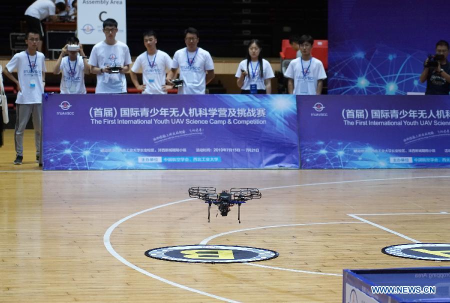Contestants control an unmanned aerial vehicle (UAV) during the first International Youth UAV Science Camp & Competition (IYUAVSCC) in Xi'an, northwest China's Shaanxi Province, July 21, 2019. The first IYUAVSCC, launched by Chinese Society of Aeronautics and Astronautics (CSAA) and Northwestern Polytechnical University, kicked off here on Monday, attracting high school students from home and abroad. (Xinhua/Shao Rui)