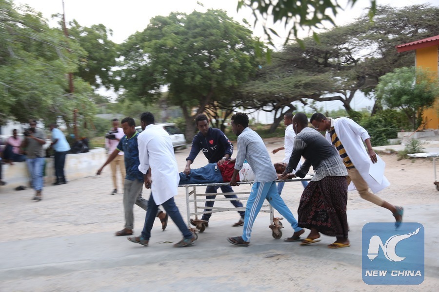 People carry a wounded person on a stretcher after a suicide attack at Mogadishu mayor's offices in Mogadishu, Somalia, July 24, 2019. Mogadishu mayor, Abdirrahman Omar Osman was injured while a district commissioner was killed when two suicide bombers blew themselves up at Banadir administration headquarters which houses the mayor offices on Wednesday. (Xinhua/Hassan Bashi)