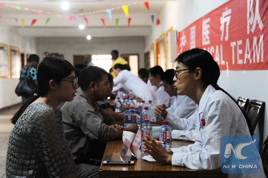Sentuo Steel Limited staff members consult Chinese doctors in Tema, Southeast Ghana, Sept. 9, 2017. Chinese medical team in Ghana on Saturday provided free physical examination to Sentuo Steel Limited staff members. (Xinhua/Shi Song)