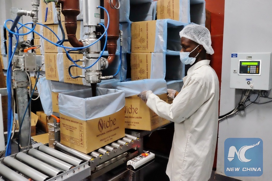 A worker works at the Niche Cocoa factory in Tema, Ghana, on Oct. 25, 2018. Niche Cocoa, a wholly-owned private Ghanaian cocoa processing company located in the Free Zones enclave in Tema, 25 km east of the capital Accra, looks forward to the opportunity to showcase the best of its products to the Chinese market. (Xinhua/Zhao Shuting)