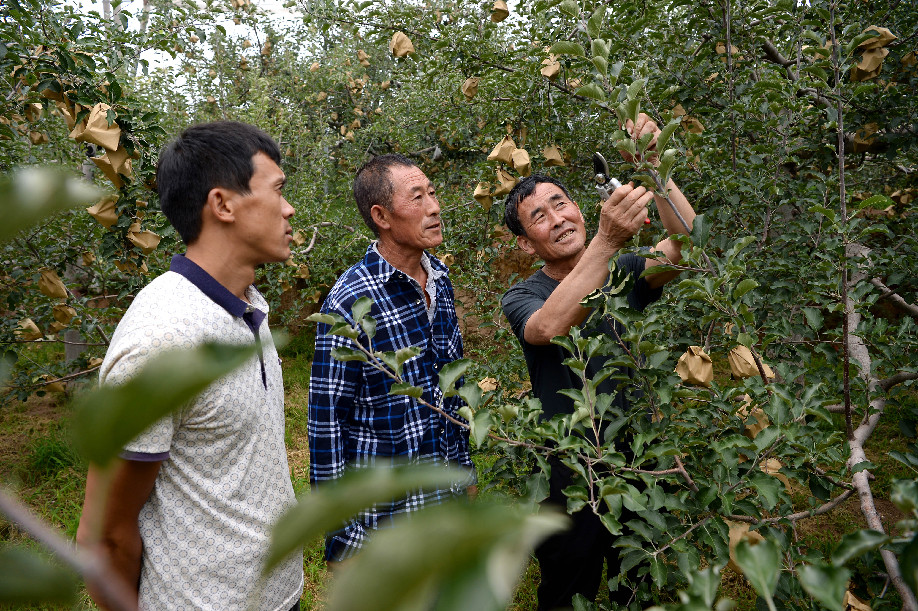 Zhang Yangang (1st R), Party secretary of Xinhu Village, checks the growing apples with villagers in Yichuan County, northwest China's Shaanxi Province, Aug. 3, 2019. (Xinhua/Liu Xiao)