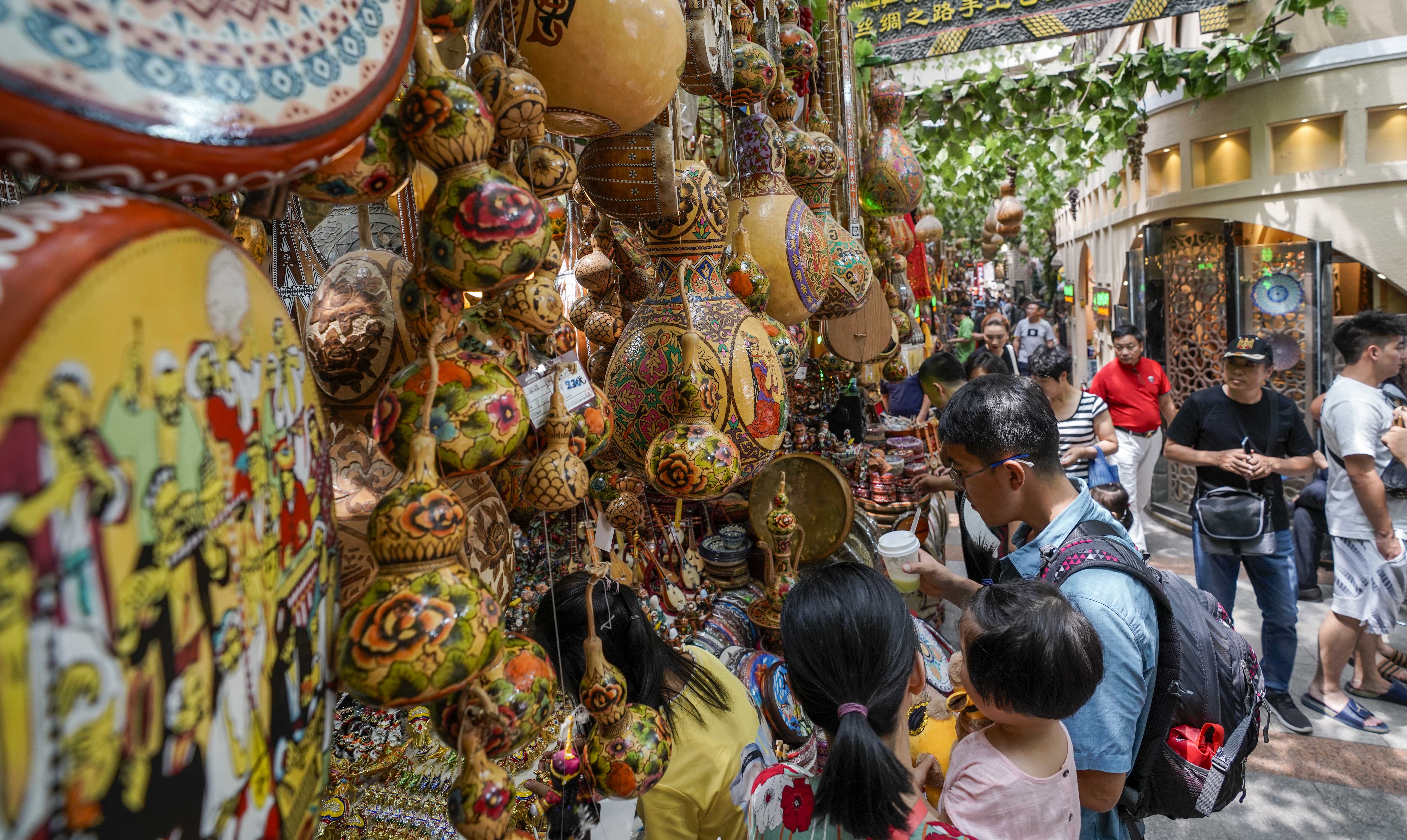 People visit the International Grand Bazaar in Urumqi, northwest China's Xinjiang Uygur Autonomous Region, July 13, 2019. (Xinhua/Zhao Ge)