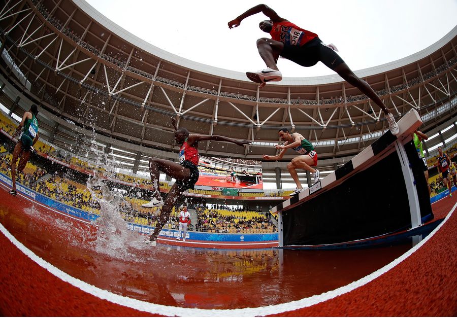 Frankline Tonui (up, R) of the United States competes during Men's 3000m Steeplechase Preliminary Round of Athletics at the 7th International Military Sports Council (CISM) Military World Games in Wuhan, capital of central China's Hubei Province, Oct. 22, 2019. (Xinhua/Wang Lili)
