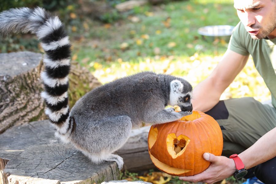 A lemur ate food from a Halloween pumpkin in the zoo of Zagreb, Croatia, on Oct. 26, 2019. (Luka Stanzl/Pixsell via Xinhua)