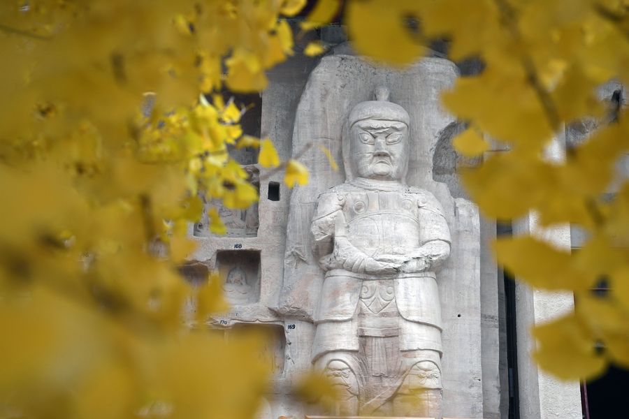 A stone statue is pictured at the North Grotto Temple in Qingyang, northwest China's Gansu Province, Nov. 5, 2019. (Xinhua/Ma Ning)