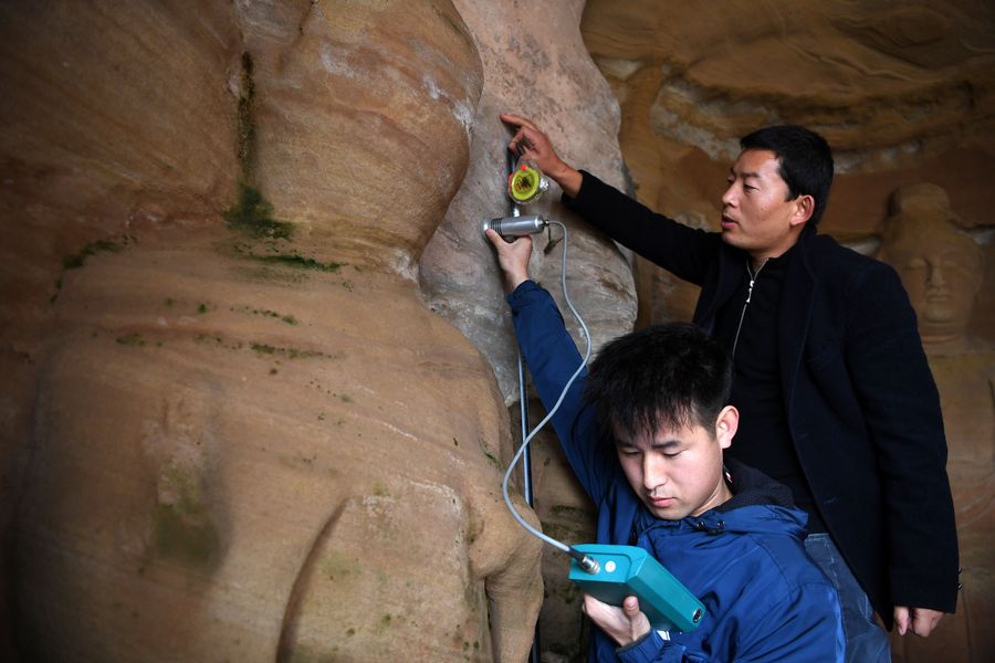 Cultural relic conservation experts conduct moisture content tests inside Cave 267 of the North Grotto Temple in Qingyang, northwest China's Gansu Province, Nov. 5, 2019. (Xinhua/Ma Ning)