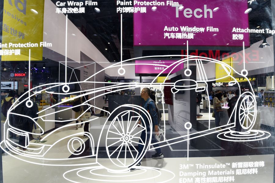 A visitor walks past the booth of 3M Company during the second China International Import Expo (CIIE) in Shanghai, east China. (Xinhua/Fan Peishen)