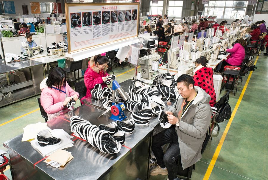 Ex-fisherman Xu Bao'an (1st R) works in a shoe factory in central China's Hubei Province, on Dec. 26, 2019. (Xinhua/Xiao Yijiu)