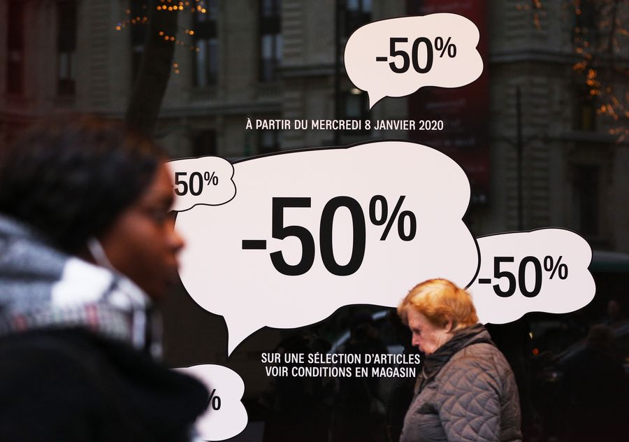 People walk past posters displaying sales information in Paris, France, Jan. 8, 2020. Winter sales in France kicked off on Wednesday and will last till Feb. 4, 2020. (Xinhua/Gao Jing)