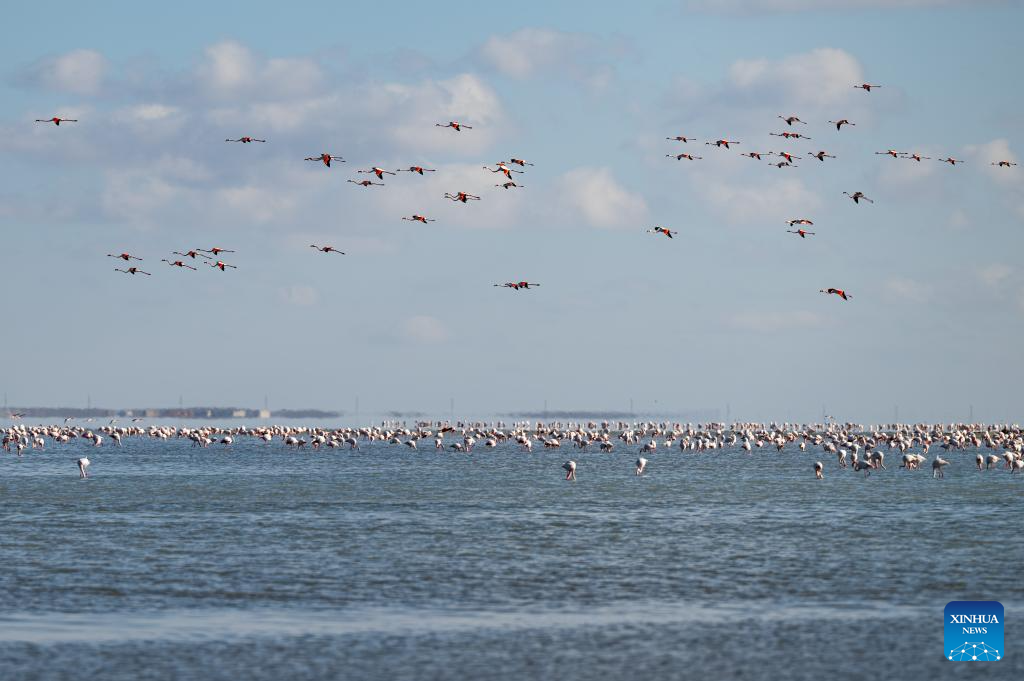 Flamingos fly over Karakol Lake on the outskirts of Aktau, Kazakhstan, on March 10, 2026. A flock of flamingos have settled on the Karakol Lake in the suburbs of Aktau, southwest Kazakhstan's Mangystau Region, before continuing on their spring migration. (Xinhua/Li Renzi)