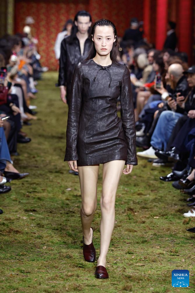 A model presents a creation from the Ready-to-Wear Fall/Winter 2026-2027 collections by Miu Miu during the Paris Fashion Week, in Paris, France, on March 10, 2026. (MeetEurope/Handout via Xinhua)