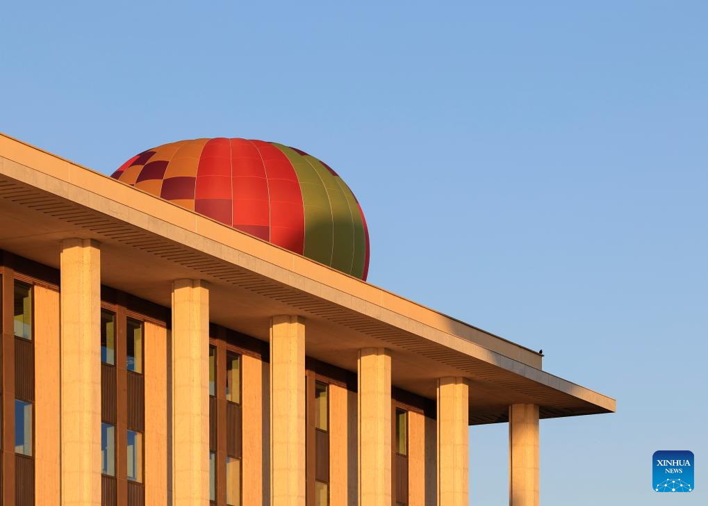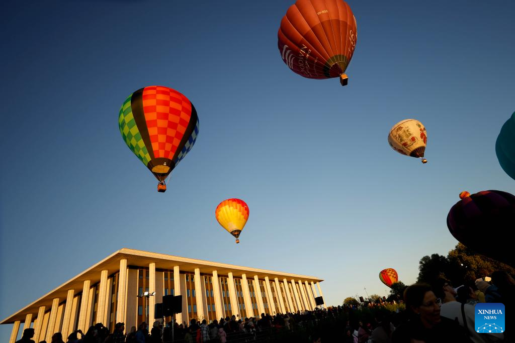A hot air balloon hovers near the National Library of Australia during the Canberra Balloon Spectacular in Canberra, Australia, March 14, 2026.