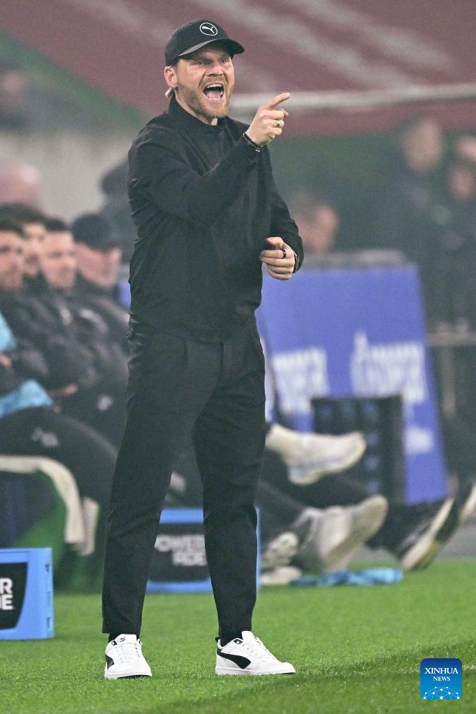 Eugen Polanski, head coach of Borussia Moenchengladbach, reacts during the German first division of Bundesliga football match between Borussia Moenchengladbach and FC St. Pauli in Moenchengladbach, Germany, March 13, 2026. (Photo by Ulrich Hufnagel/Xinhua)