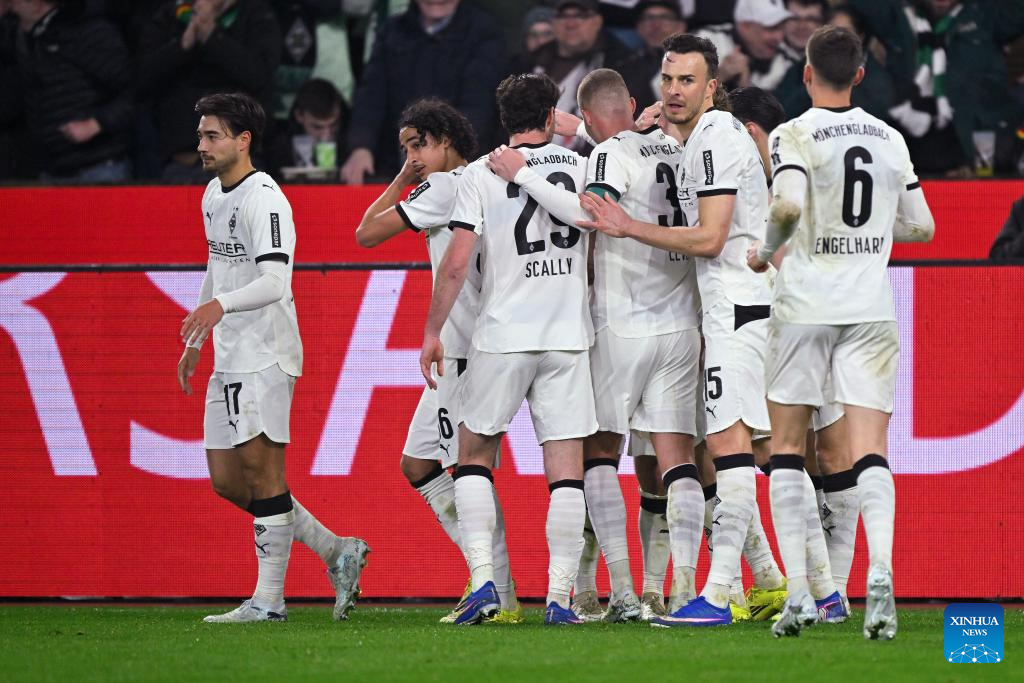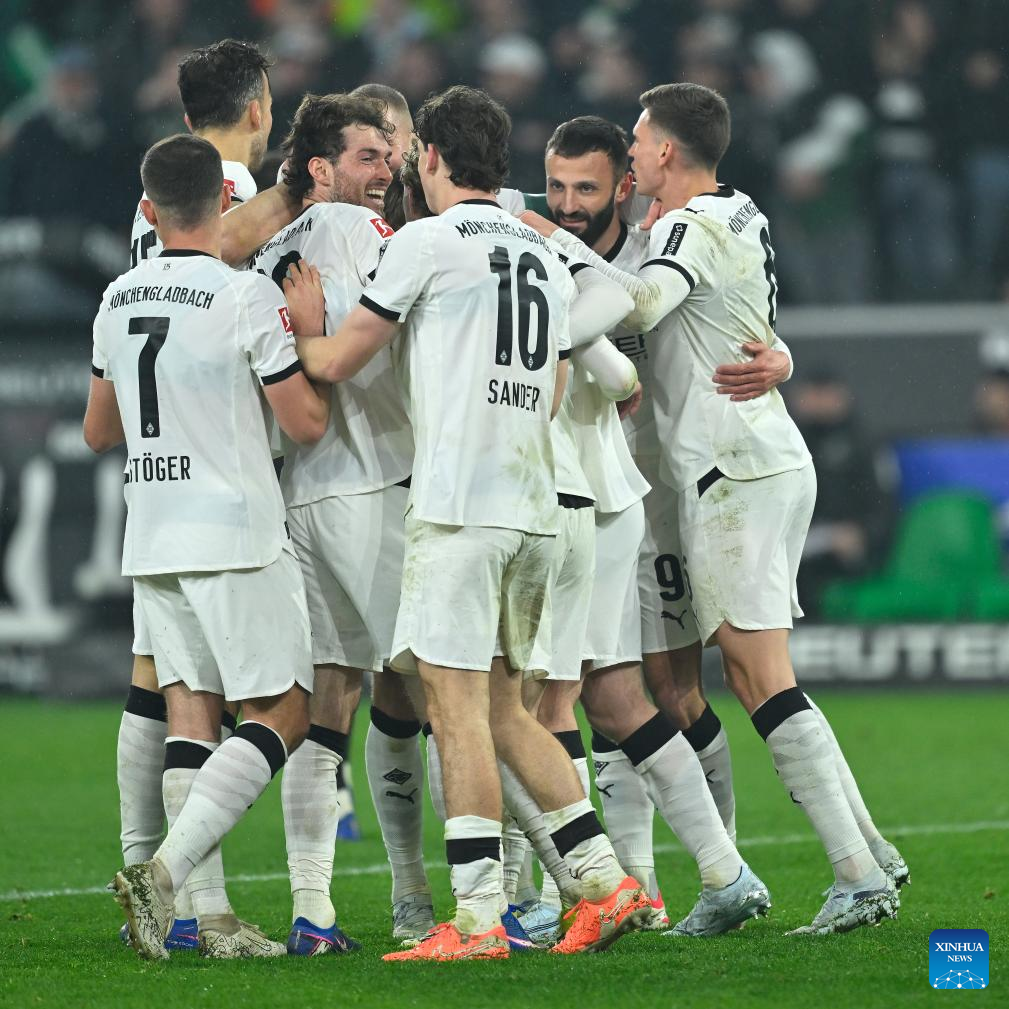 Players of Borussia Moenchengladbach celebrate scoring during the German first division of Bundesliga football match between Borussia Moenchengladbach and FC St. Pauli in Moenchengladbach, Germany, March 13, 2026. (Photo by Ulrich Hufnagel/Xinhua)