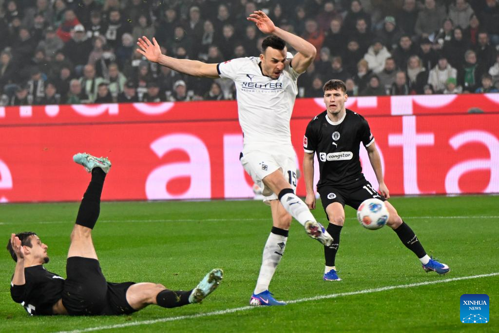 Haris Tabakovic (C) of Borussia Moenchengladbach shoots during the German first division of Bundesliga football match between Borussia Moenchengladbach and FC St. Pauli in Moenchengladbach, Germany, March 13, 2026. (Photo by Ulrich Hufnagel/Xinhua)
