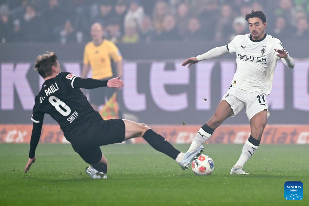 Franck Honorat (R) of Borussia Moenchengladbach vies with Fujita Joel Chima of FC St. Pauli during the German first division of Bundesliga football match between Borussia Moenchengladbach and FC St. Pauli in Moenchengladbach, Germany, March 13, 2026. (Photo by Ulrich Hufnagel/Xinhua)