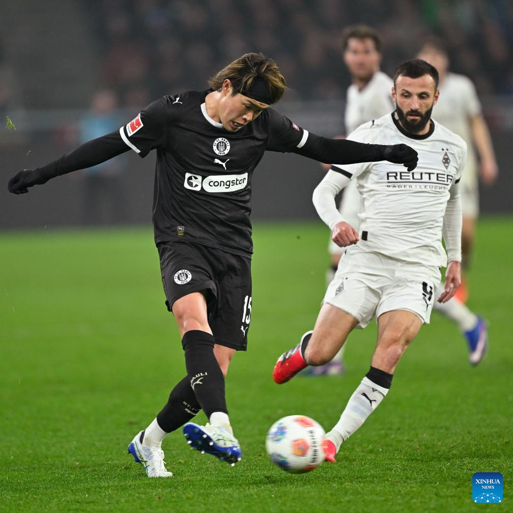 Joe Scally (R) of Borussia Moenchengladbach vies with Lars Ritzka of FC St. Pauli during the German first division of Bundesliga football match between Borussia Moenchengladbach and FC St. Pauli in Moenchengladbach, Germany, March 13, 2026. (Photo by Ulrich Hufnagel/Xinhua)