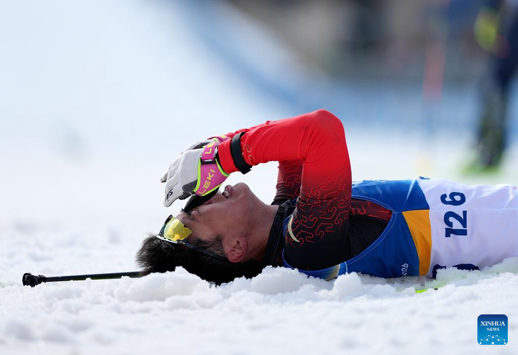 Yu Shuang of China reacts after winning the final of Para Biathlon Men's Sprint Pursuit Vision Impaired event at the Milan-Cortina 2026 Paralympic Winter Games in Tesero, Italy, March 13, 2026. (Xinhua/Hou Zhaokang)