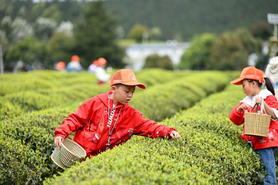 Children learn to pick tea leaves at a tea garden during the spring break in Kaiyang County of Guiyang, southwest China's Guizhou Province, April 1, 2026. (Photo by Yuan Fuhong/Xinhua)