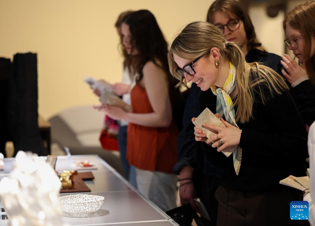 A visitor views exhibits at the 2026 edition of China Week during Milan Design Week in Milan's Paolo Sarpi area, Italy, April 23, 2026. (Xinhua/Li Jing)