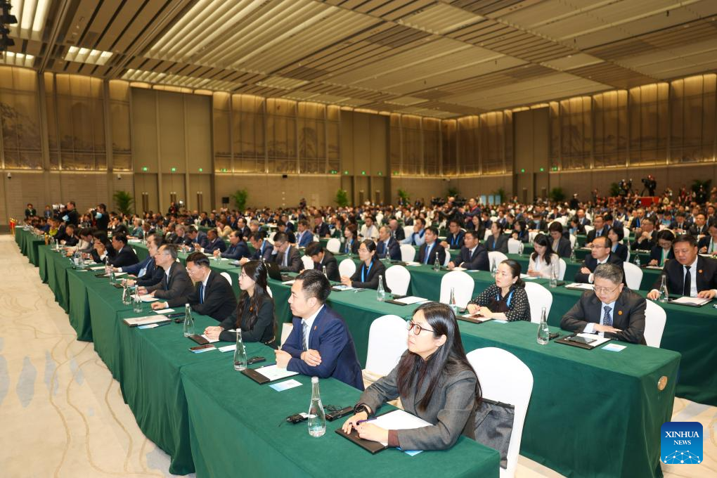 This photo taken on April 29, 2026 shows a scene during the opening ceremony of the Green and Sustainable Development Forum of the Shanghai Cooperation Organization (SCO) in Ningbo, east China's Zhejiang Province. Opened on Wednesday in Ningbo, the forum is co-hosted by the SCO Good-Neighborliness, Friendship and Cooperation Commission, the Ministry of Ecology and Environment, and the People's Government of Zhejiang Province. (Xinhua/Jiang Han)