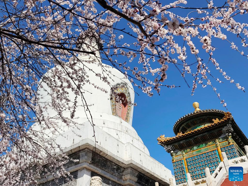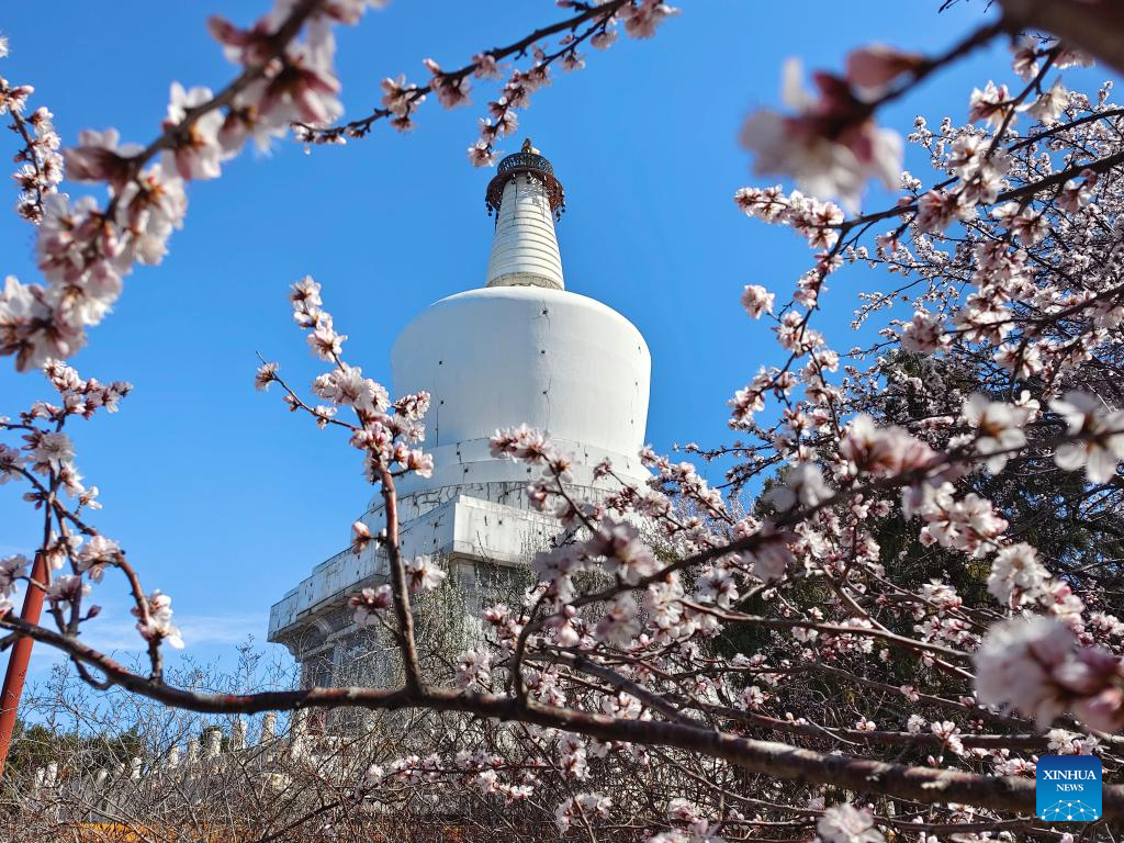 Blooming flowers are seen with the White Pagoda in the background at Beihai Park in Beijing, capital of China, March 14, 2022. (Xinhua/Xu Jinquan)