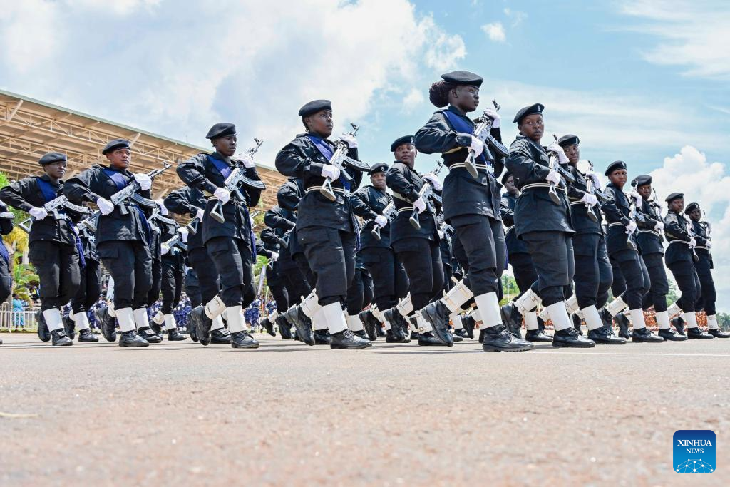 Ugandan female police officers march at an all-women military parade to mark International Women's Day, in Kampala, Uganda, on March 8, 2026. Uganda on Sunday held an all-women military parade to mark International Women's Day, observed this year under the national theme "Scaling up investment to accelerate access to justice for women and girls across Uganda." (Uganda Vice President Press Unit/Handout via Xinhua)
