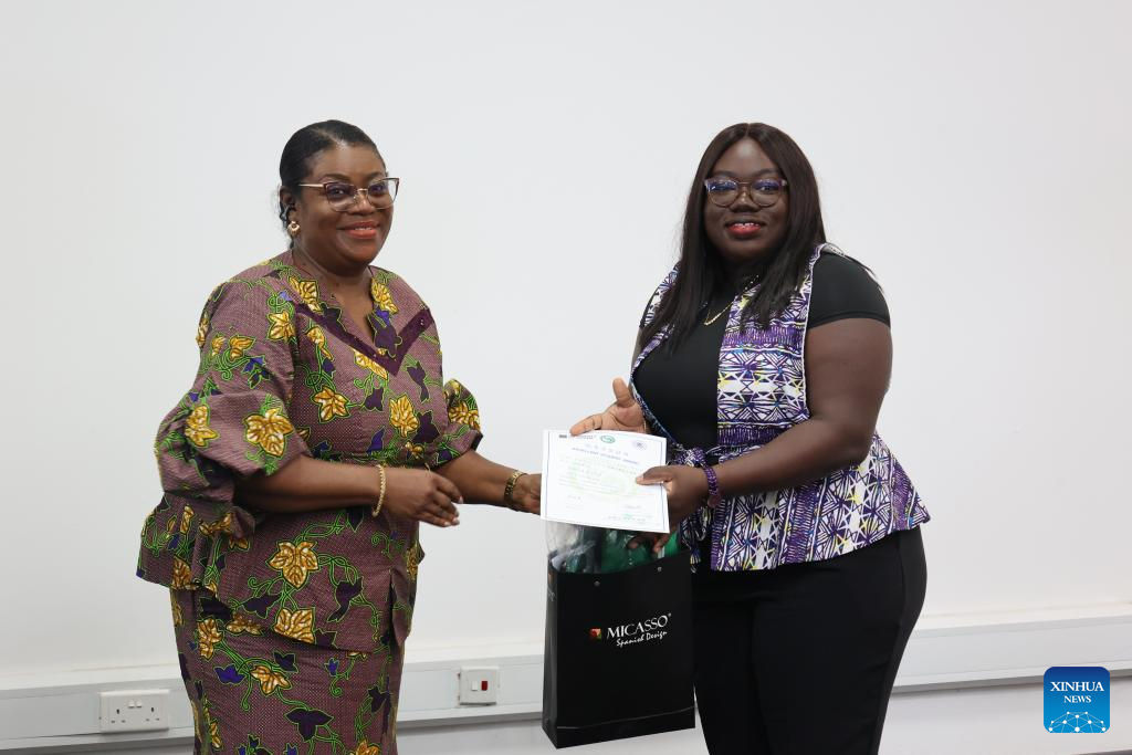 Liu Baijun (L), the Chinese director of the Confucius Institute at the University of Ghana, presents a certificate to a student at the graduation ceremony in Accra, Ghana, March 12, 2026. At least 81 Ghanaian public sector workers from the Ministry of Foreign Affairs and other ministries, departments and agencies graduated from an 11-week Chinese language proficiency training program on Thursday. (Photo by Seth/Xinhua)