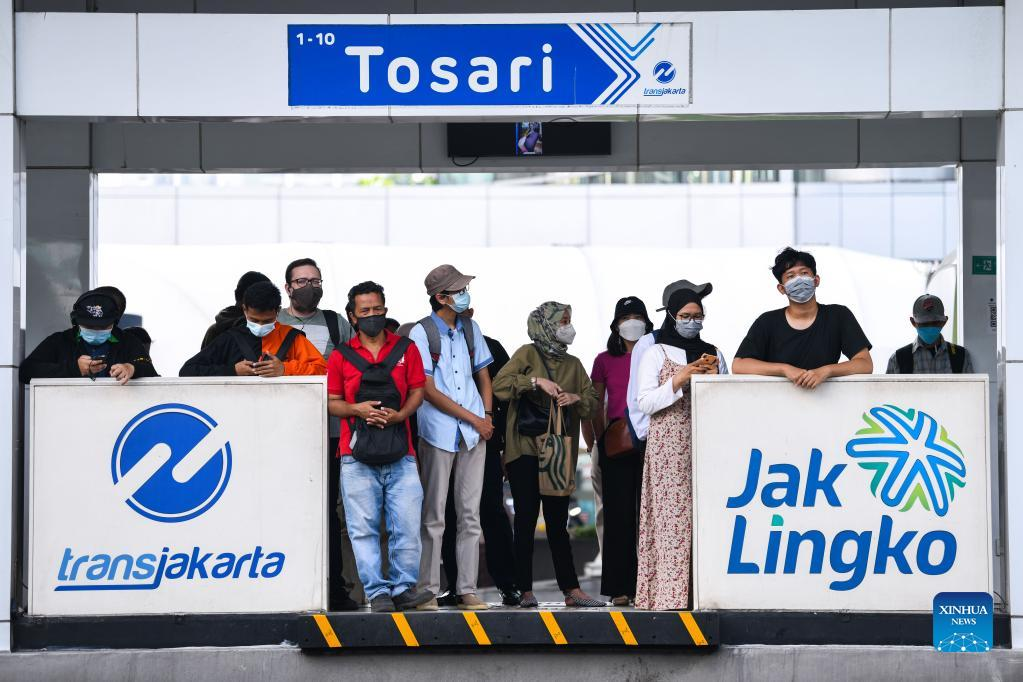 People wearing masks wait for buses at a bus stop in Jakarta, Indonesia, March 27, 2022. Indonesia has registered more than 6 million cases of COVID-19 since the first case was confirmed in the country in March 2020. On Monday, the Health Ministry reported that the coronavirus cases across the archipelago rose by 2,798 within the past 24 hours to 6,001,751 with the death toll adding by 104 to 154,774. (Xinhua/Xu Qin)