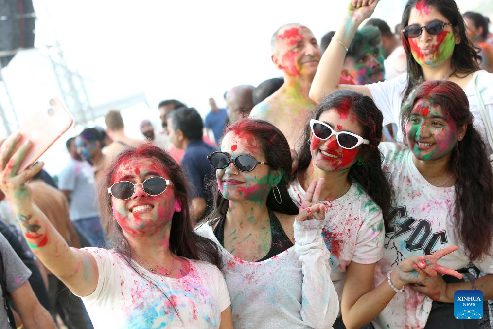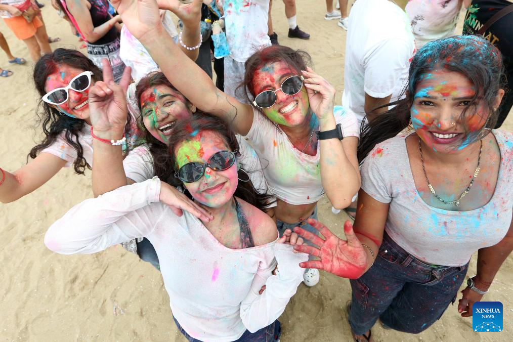 People smeared with colored powder pose for photos during the celebration of Holi festival in Pattaya, Thailand, March 13, 2026. (Xinhua/Rachen Sageamsak)